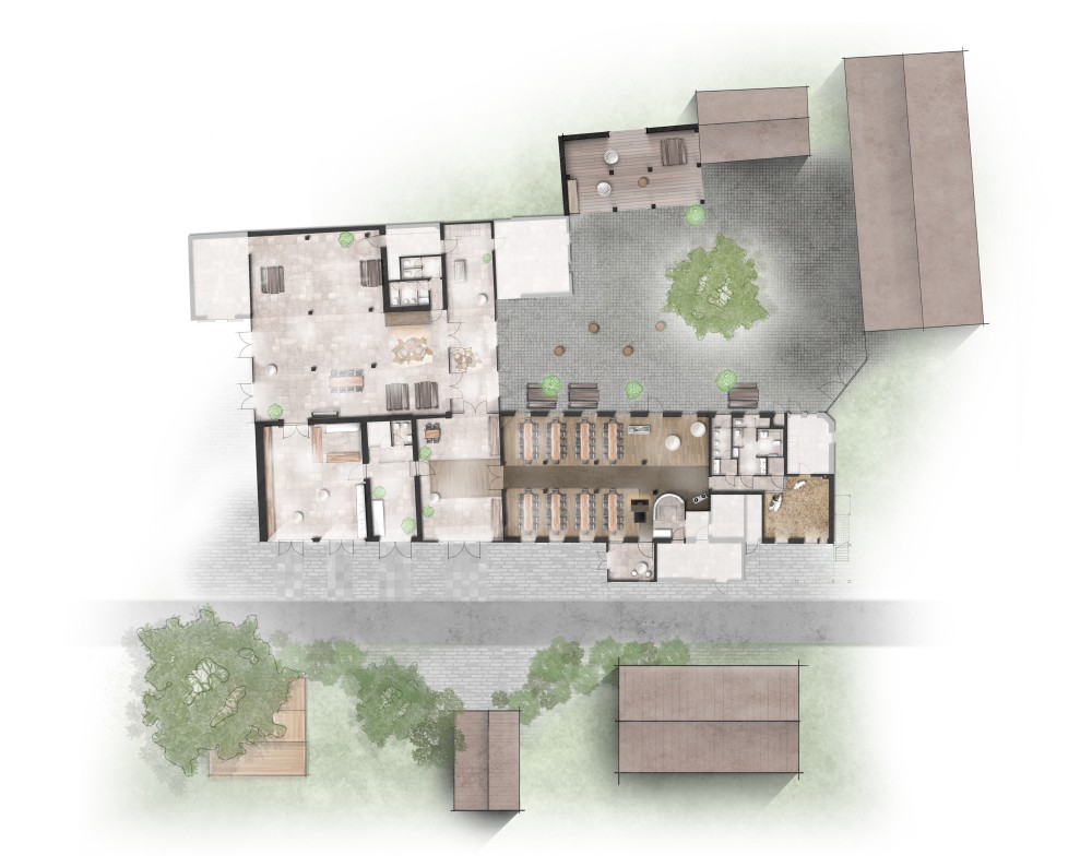 Das Foyer ist unser "Verbindungs-Raum" mit modernem Lichtkonzept, Lounge-Möbeln und der Aussicht zum Innenhof. Hier trifft man sich auf eine Zigarette oder zum Kaffeeplausch.